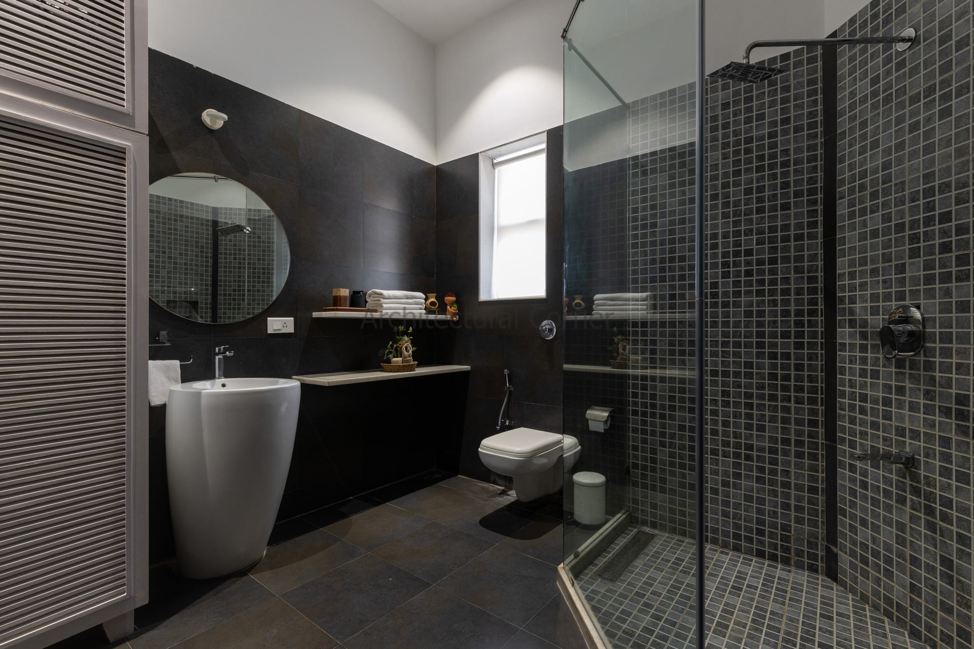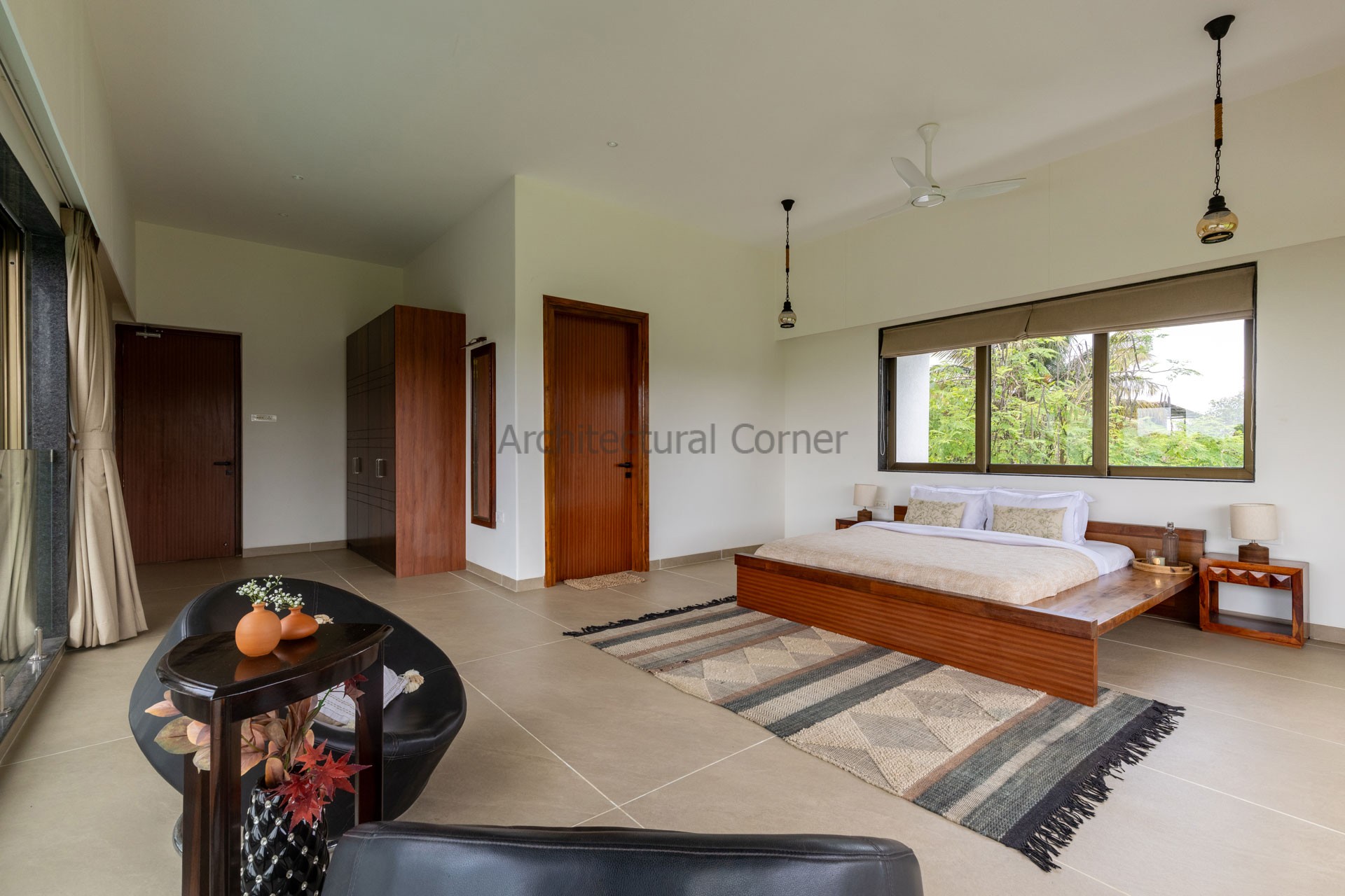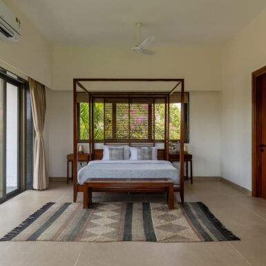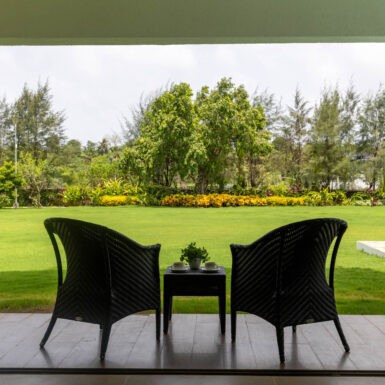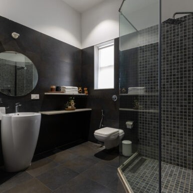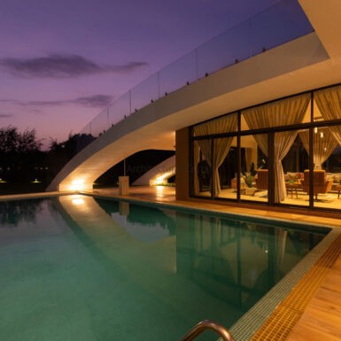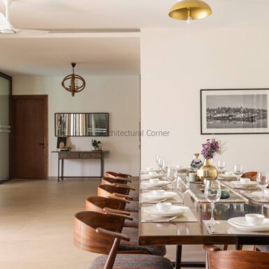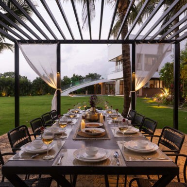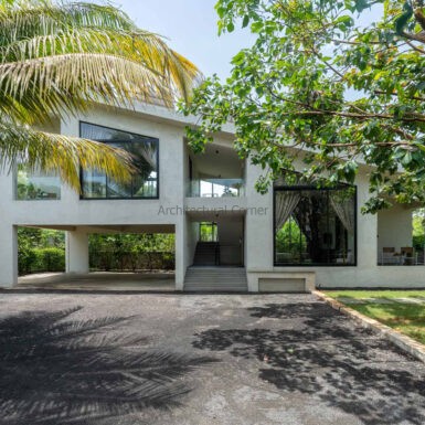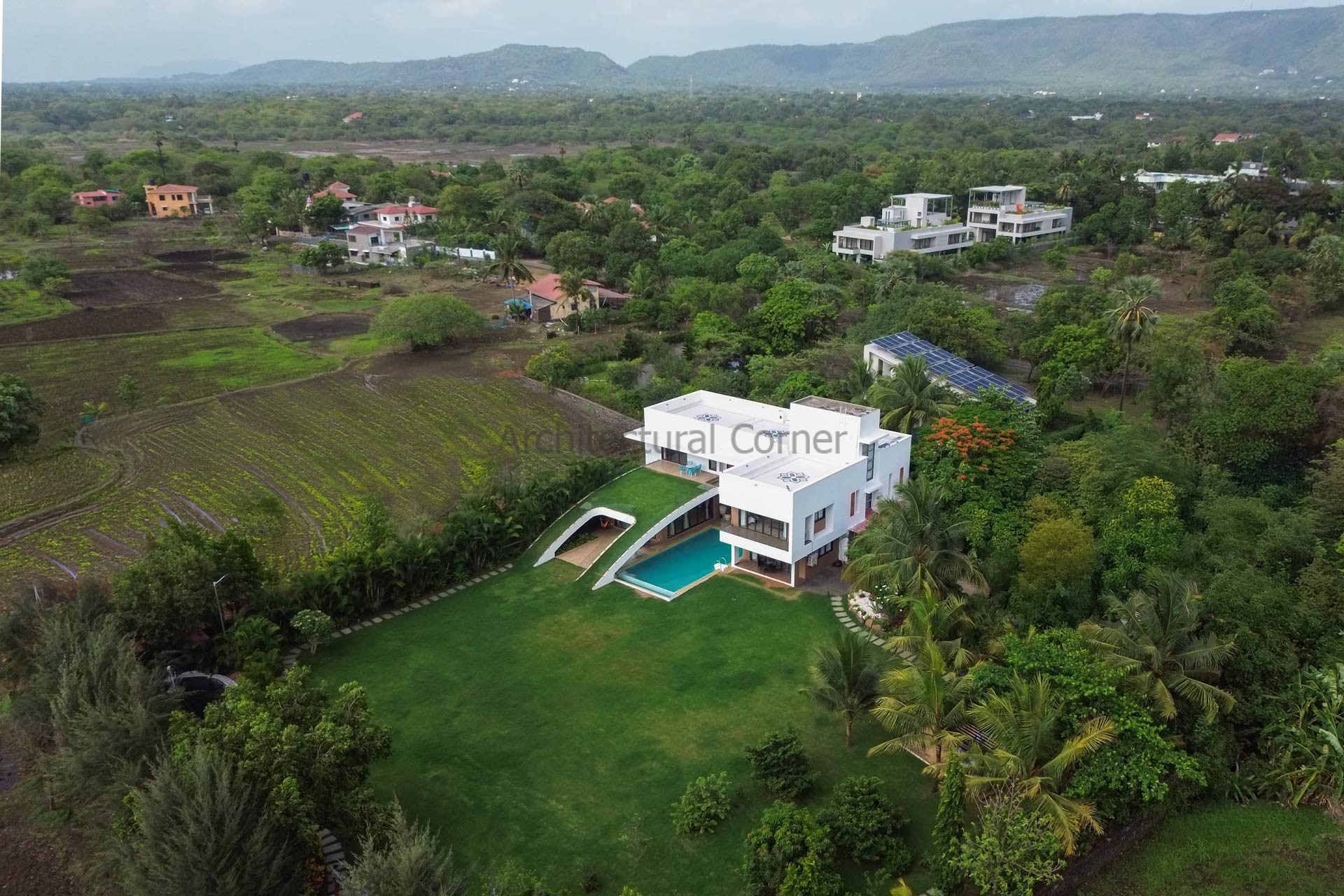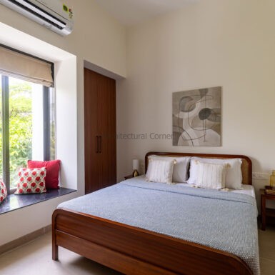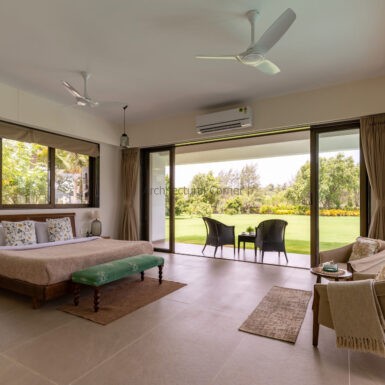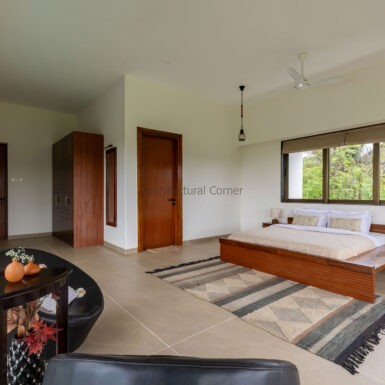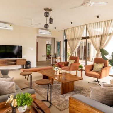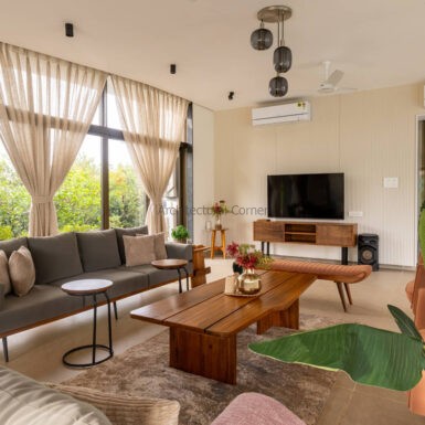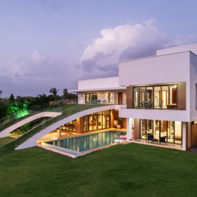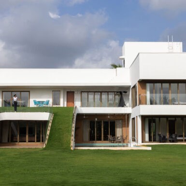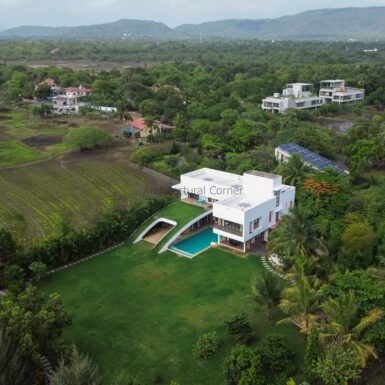Set amidst a serene landscape of Alibaug is a residence that accentuates the nature that encompasses it. The bungalow spreads across two levels where the lower level is a sprawling open plan overlooking the sparkling blue water of the pool. The focal point of this abode is an accessible sloping green roof which connects the Master bedroom to the Garden.